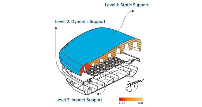 المستوى 1: يوفر توزيع حجم الثقوب المخروطية دعمًا مختلفًا للصلابة في وضع الجلوس. المستوى 2: توفر نقطة الدعم مخزنًا مؤقتًا مختلفًا في حالة الالتواء. المستوى 3: توفر الفجوة بين المساحة دعمًا للوسادة في ظل التأثير الديناميكي.