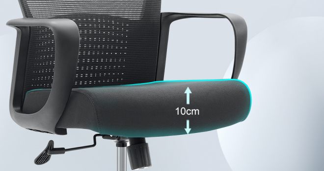 | تعديل ارتفاع المقعد | إسفنج مصبوب 10 سم لوسادة الجلوس، ورافعة غاز سوداء بطول 100 مم | / | ||